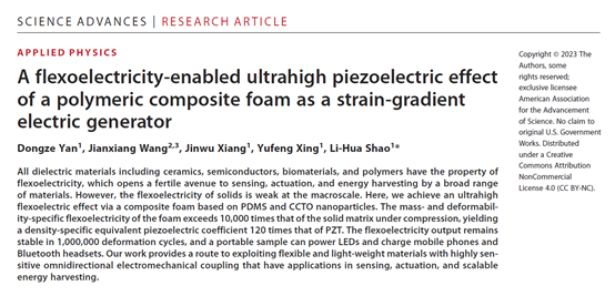 固体力学研究所邵丽华教授与向锦武院士、邢誉峰教授合作在Science Advances发表了题为 “A flexoelectricity-enabled ultrahigh piezoelectric effect of a polymeric composite foam as a strain-gradient electric generator”的研究论文(//www.science.org/doi/10.1126/sciadv.adc8845),报道了关于超高挠曲电效应的最新研究成果。