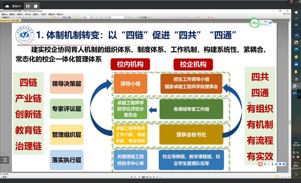的基本情况。他指出,新时代对卓越工程师的培养提出了新要求,领域产教融合要以“四链”促进“四共”、“四通”,围绕关键领域,坚持项目牵引,深入开展选拔优质生源、重构课程体系、重塑学生能力以及重建评价体系等工作。希望通过此次校企联合研讨,坚持目标导向、问题导向和系统观念,进一步明确培养方案制定和校企深度联合培养等过程中的痛点和难点,共谋解决思路和举措,加速推动领域卓越工程师培养方案的完善,校企协同打造卓越工程师培养范式。