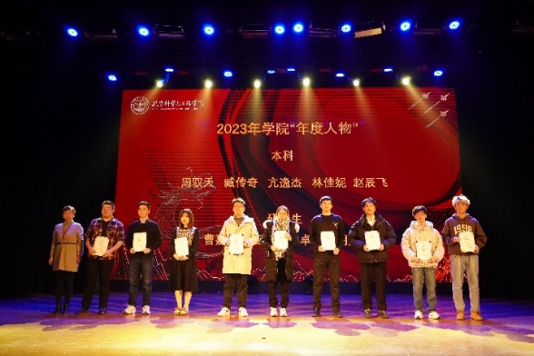 党委书记鲍蕊老师为获得2023 学生“年度人物”的同学颁发证书,主持人通过PPT介绍了在2023 年取得优异成绩的学生团队与个人的情况。