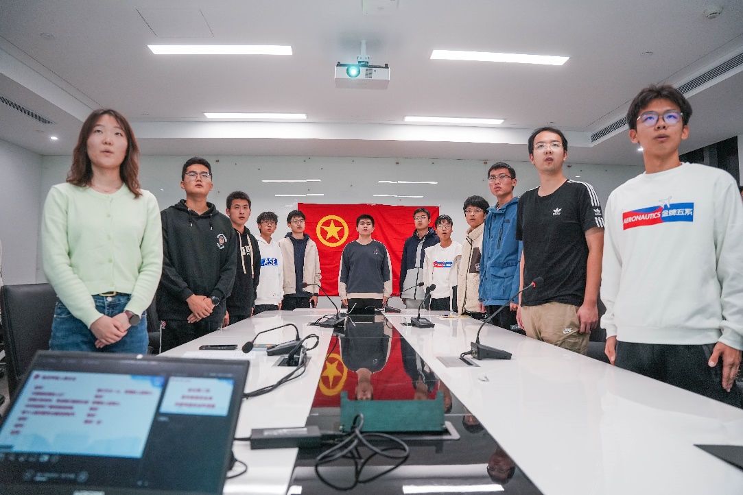 优秀团员代表牛硕带领新团员宣誓,全体新老团员高举右拳,以饱满的精神面貌向团组织坚定表明为共产主义事业而奋斗的理想信念。