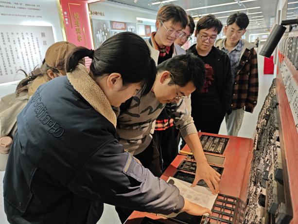 在另一侧的展厅中,关于“汉字激光照排之父”王选先生的专题展览吸引了大批参观者。展览以“告别铅与火”为主题,生动讲述了王选先生如何带领团队突破技术壁垒,用先进的激光照排技术改变了中国印刷业,开启了“告别铅与火”的现代化新篇章。展览中的经典设备、珍贵手稿以及王选先生奋斗经历的重现,不仅让参观者感慨科技改变生活的力量,更为大家树立了“勇于创新,锐意进取”的榜样。此外,支部成员们还依次尝试使用活字印刷技术,感受了中国古人四大发明的魅力。