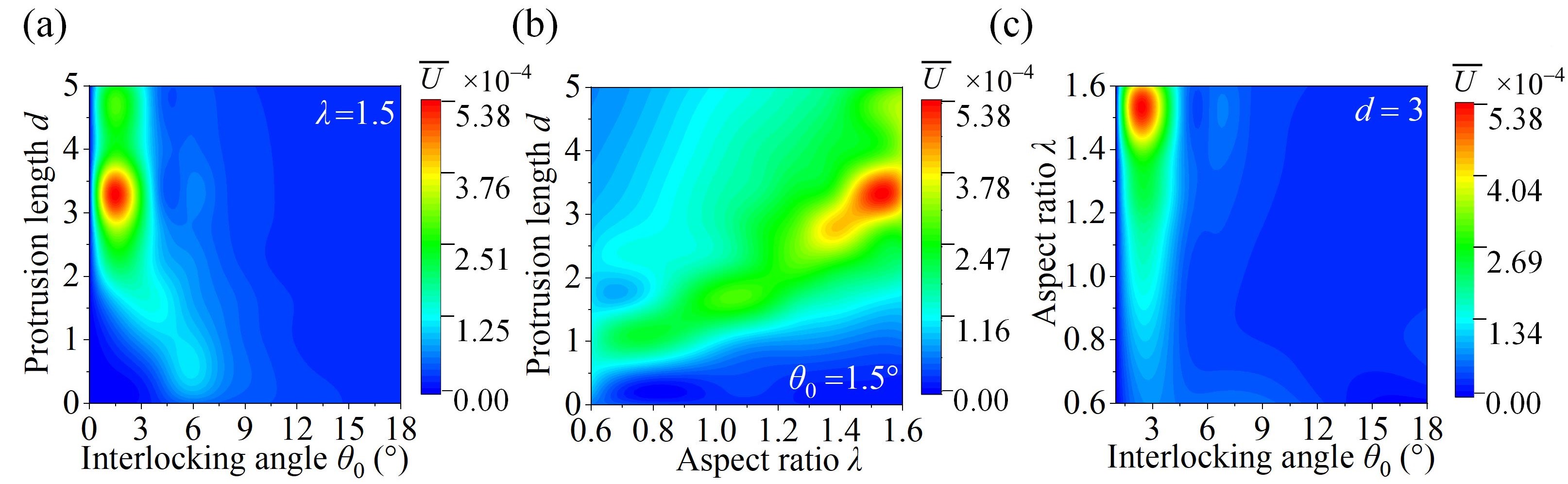 研究者们探讨了缝线的纵横比、联锁角和指凸长度等因素对结构承载能力、变形能力和能量吸收的影响,揭示了其结构—性质之间的内在联系。结果显示,缝线的联锁水平越高,其刚度和强度越大;延长缝线的指凸段,可以增大拉出距离、提高结构韧性,但同时会加大结构失效的风险。如图5所示,纵横比、联锁角和指凸长度之间存在竞争机制;与另外两个参数相比,指凸长度对韧性的影响更为显著。