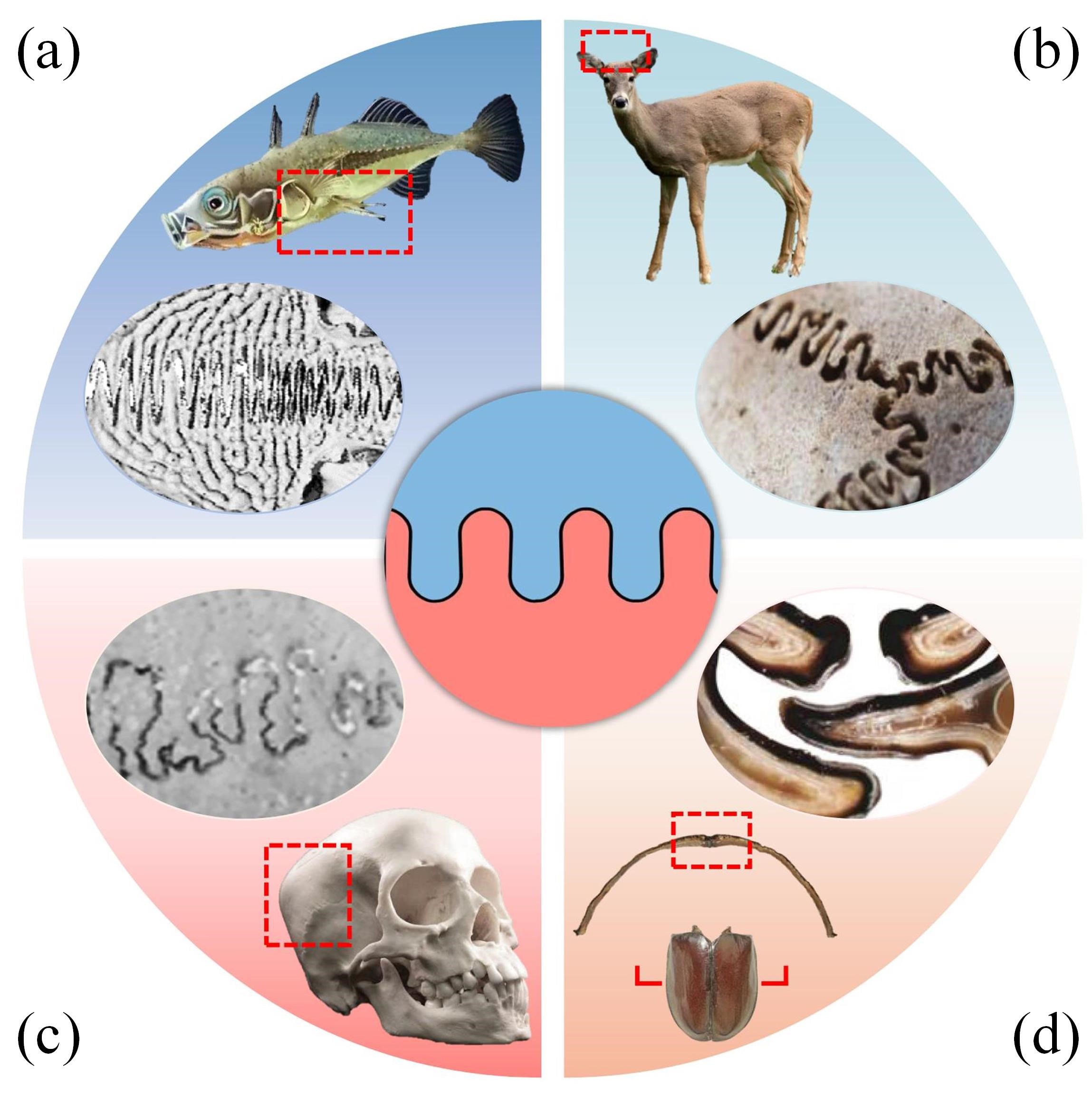 生物结构的界面形貌往往复杂而精巧,兼顾性质与功能。叉指型互锁结构不仅具备出色的防护功能,还保留了结构不同组成部分之间相对运动的灵活性,其独特形貌之下所蕴藏的强韧化与优化机理引起了学者们的关注。如图1所示,叉指型缝线广泛存在于各类生物结构中。不同于圆型、正弦型等其他类型的缝线结构,其在与界面垂直的方向上具有互锁效应。叉指型缝线允许结构的各个组成部分在一定程度上发生相对运动,灵活的连接特性能帮助生物获得独特的生存技能。然而,此类缝线结构的设计机理、力学优势等尚不清晰,有待进一步研究。