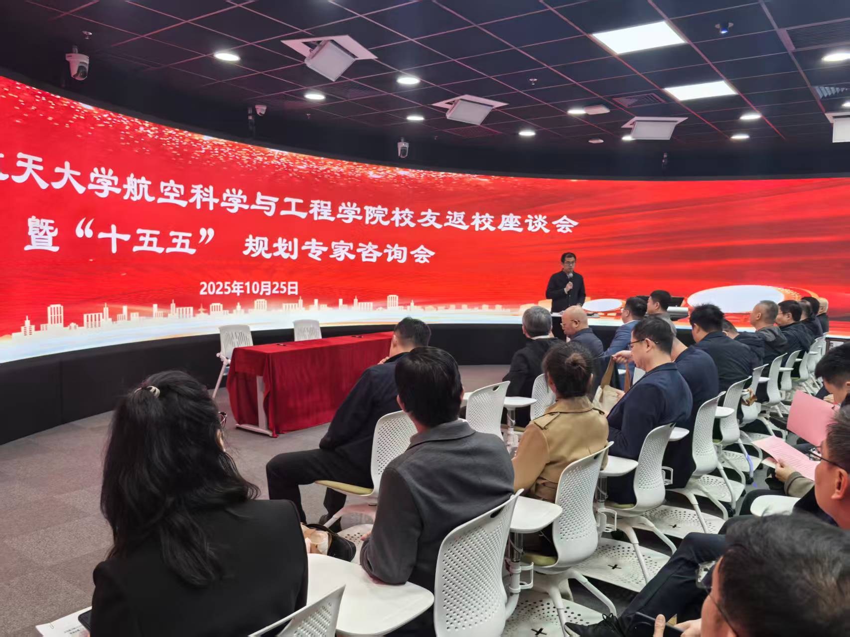 )在北航沙河校区科研2号楼107智慧教室召开校友返校座谈会暨“十五五”规划专家咨询会。本次会议以“凝聚校友力量、深化校企合作、擘画‘十五五’新局”为主题,包含校企合作协议互换、“航空之友”奖学金颁发、企业导师聘用、“十五五”规划研讨等内容。