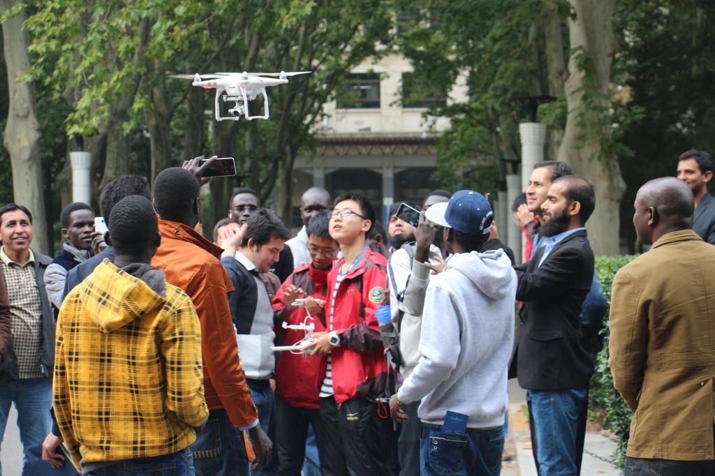 随后,北航航模队在主楼前进行了精彩的航模表演,展示了多旋翼稳定飞行以及空中航拍,获得了外国留学生阵阵热烈的鼓掌。