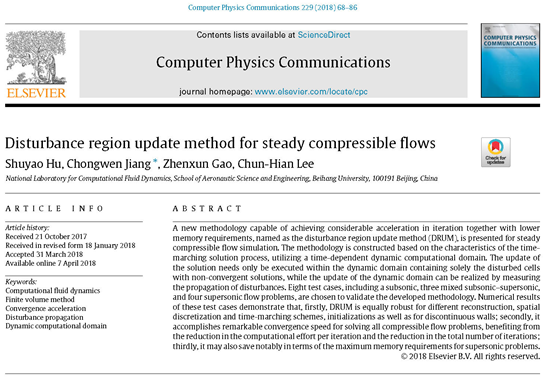 李椿萱院士团队的博士生胡姝瑶和蒋崇文副教授、高振勋副教授在物理数学领域排名第一的国际顶级期刊《Computer Physics Communications》上发表题为《Disturbance region update method for steady compressible flows》的学术论文。该文章是我校完整足球比分