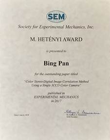潘兵教授及其博士生俞立平获得美国实验力学学会(SEM)2017年HetényiAward。Hetényi Award用于表彰国际实验力学领域旗舰期刊《Experimental Mechanics》上一年度(2017)的最佳研究论文,这也是该奖自1967年设立以来首次授予中国高校和研究机构的学者。获奖论文题为“Color stereo-digital imagecorrelation method using a single 3CCD color camera”,该论文的主要贡献在于首次创新性地提出了一种基于单个彩色CCD相机的全靶面、单相机三维变形测量方法。该论文在2017年《Experimental Mechanics》所有发表的120篇论文中引用排名第一,已入选ESI高被引论文(前1%)。