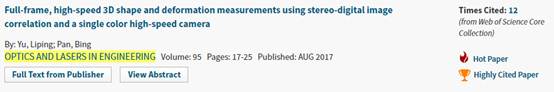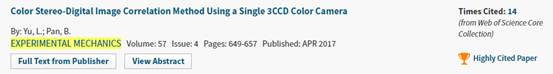 潘兵教授及其博士生俞立平2017年还将这一方法推广用于彩色高速相机,实现了单高速相机瞬态三维变形测量方法,这一新型测试方法在爆炸、冲击、振动等需要实现瞬态位移和变形测量的领域具有重要应用前景。相关成果题为“Full-frame, high-speed3D shape and deformation measurements using stereo-digital image correlationand a single color high-speed camera”发表在《Optics and Lasers inEngineering》上,该论文近期同时入选ESI高被引论文(前1%)和热点论文(Hotpaper,1月/2月 2018 内受到引用的次数在Engineering学术领域中最优秀的 0.1% 之列)。