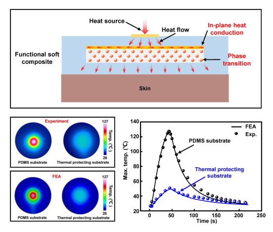 针对上述问题,李宇航老师团队提出了一种新型功能性柔性复合材料设计,作为可穿戴柔性电子器件的热防护基底,能够在保持基底柔性的前提下控制热流和有效地吸收热能。该功能性柔性复合材料是将金属薄膜与相变材料嵌入柔性高分子聚合物中(图1),一方面,通过金属薄膜增加沿面内方向传输的热流进而减少沿面外方向(传向人体)的热流,另一方面,过量热量会被相变材料发生相变吸收并保持温度不变(即相变温度)。与传统可穿戴电子器件的柔性基底相比,该柔性热防护基底可将温度峰值降低85%以上。
