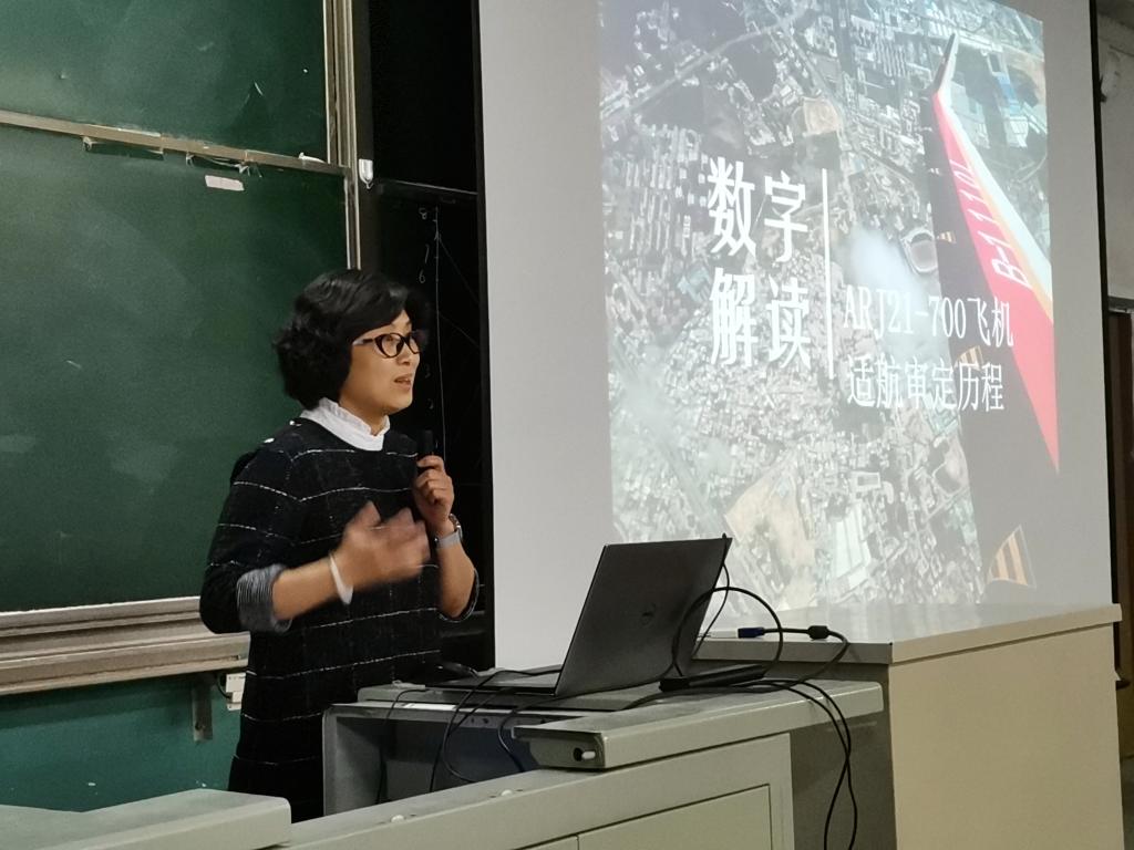 刘济美女士用一个个数字,对中国第一次完全自主设计并制造的喷气式支线客机ARJ21-700在适航审定过程中所取得的成绩和遇到的困难一一进行讲解。从适航符合性证明材料叠起来高达30米,到机翼在2.5g极限载荷静力试验中挠度达1.8米;从刹车过程中刹车装置温度高达2000摄氏度,到飞机在结冰试验中结冰厚度达3英寸;从最初只有7名ARJ21-700的机长,到现在拥有72名机长……ARJ21-700走过了艰难而曲折的适航审定历程,终于成功取证,并迈向民航市场。课堂上,同学们非常认真地聆听报告;课后,很多同学还结合目前自己飞机设计过程中遇到的困惑专门向刘女士请教,充分体现了同学们对我国航空领域进展的关注和热情。