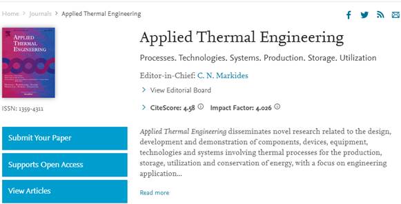 文东升教授应邀担任国际著名学术期刊《AppliedThermal Engineering》副主编(Associate editor)。该期刊由著名学术出版商Elsevier公司发行,是能源、工程技术领域的Q1区SCI期刊,收录的作品以原创性论文、综述、快讯等内容为主,影响因子4.026。