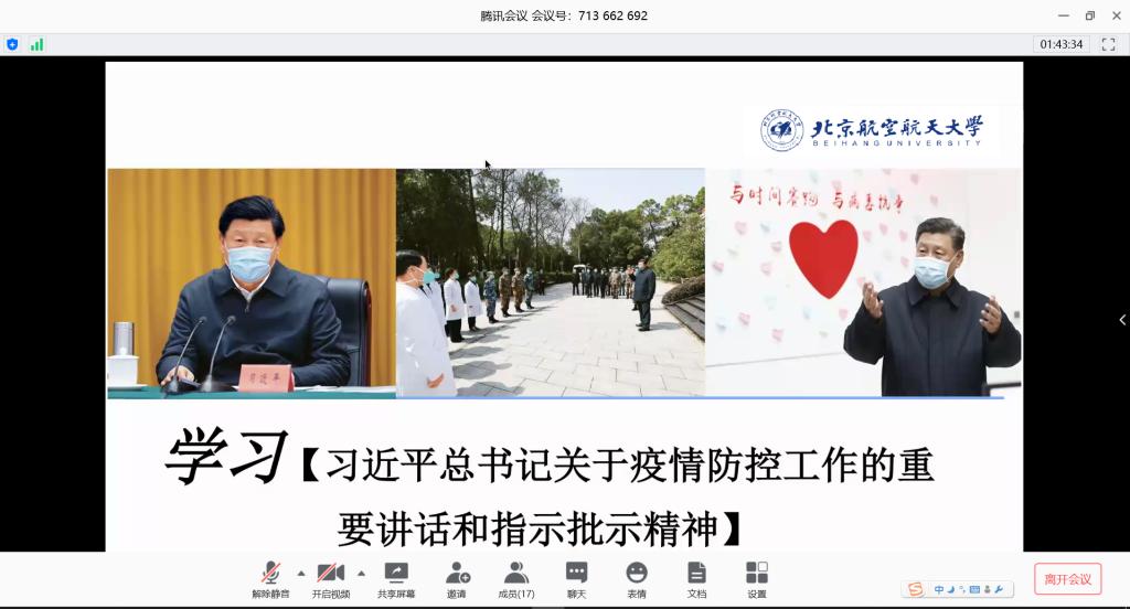 随后,副院长万志强领学了习近平总书记关于疫情防控工作的重要讲话和指示批示精神。万志强以时间为脉络,带领大家系统学习了习近平总书记在湖北省考察新冠肺炎疫情防控工作时的讲话、习近平对安全生产作出的重要指示、《求是》杂志发表的习近平总书记重要文章《团结合作是国际社会战胜疫情最有力武器》,他表示,新冠肺炎疫情已在全球多国多点爆发并迅速扩散蔓延,习近平总书记强调,人类是一个命运共同体。病毒没有国界,疫情不分种族。任何国家都不能置身其外,独善其身。战胜关乎各国人民安危的疫病,团结合作是最有力的武器。面对人类共同的敌人,只要秉承“人类命运共同体”理念,坚持“携手抗疫、共克时艰”,就一定能够彻底战胜疫情,迎来人类发展更加美好的明天!