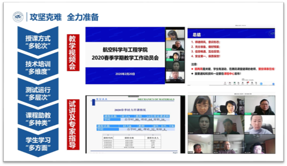 “航空航天概论”先后被评为国家级精品课、国家级精品视频公开课/资源共享课/在线开放课和中国大学MOOC,并上线“学习强国”,是北航“国字头”最多的课程;“隐身飞机探究与设计虚拟仿真实验”国家级虚拟仿真实验项目获批国家级虚拟仿真金课;“理论力学”、“材料力学”被评为国家级资源共享课;“飞机结构设计”、“材料力学多学时课程”、“材料力学研讨与进阶1”、“材料力学研讨与进阶2”、“工程力学”等课程获批2019年校级MOOC建设。这些课程的建设为本次线上教学提供了良好的基础和资源,例如,“航空航天概论”课程团队运用“双MOOC+微信群+腾讯会议”形式,以爱课程中国大学MOOC“航空航天概论”为主、学堂在线“航空航天技术”为辅,高质量开展线上教学;程小全老师负责的“飞机结构设计”MOOC课程于本学期上线,提供了视频与课件下载功能,有效服务了疫情期间线上教学工作。