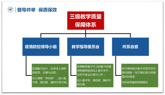 教学指导委员会委员进入每门课程的线上课堂,跟听课程并在课后对教师进行指导,提升教学质量;此外,系所在课前及课后对教师的课程安排及授课情况进行把关,确保每门课程的质量和效果。