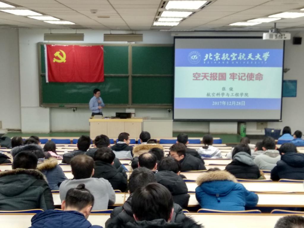 张俊老师宣讲的主题是“空天报国牢记使命”,以“什么是使命?”为开端引起同学们的思考,结合自身经历围绕“回国”和“出国”与同学们进行亲切的交流,出国可以拓宽国际视野、促进文化交流,回国是为了响应祖国召唤、投身祖国建设。在此基础上,张老师解读了如何践行“四个正确认识”,最后对同学们提出了期望,希望同学们做到理想高远、学识一流、胸怀寰宇、致真唯实,为推进祖国航空航天事业发展做出不懈努力,为中国梦早日实现做出更大贡献!