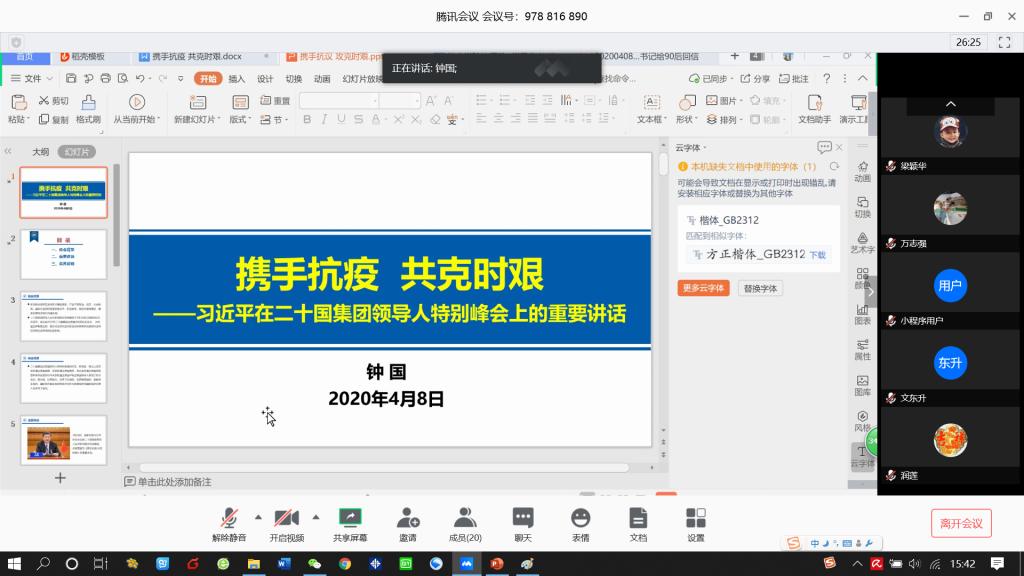 随后,钟国老师从峰会背景、重要讲话、各界反响三个部分,带领大家集体学习了习近平总书记3月26日在北京出席二十国集团领导人应对新冠肺炎特别峰会时发表的题为《携手抗疫 共克时艰》的重要讲话。习近平总书记在讲话中强调,“我们应该直面挑战、迅速行动。我坚信,只要我们同舟共济、守望相助,就一定能够彻底战胜疫情,迎来人类发展更加美好的明天!”。同时,习近平总书记就会议议题提出四点倡议:坚决打好新冠肺炎疫情防控全球阻击战、有效开展国际联防联控、积极支持国际组织发挥作用、加强国际宏观经济政策协调。