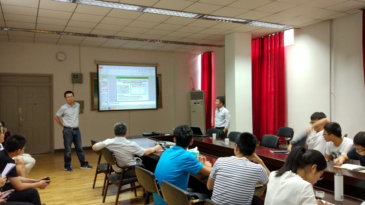 随后,Cheng Wang正式开始了他的报告宣讲。在他的报告中,首先介绍了微流体环境中微米级颗粒的操作在生物医学、食物、环境等方面的应用。报告中主要讨论了两种简单的微粒子操作方法。第一种方法利用了微气泡中压力脉动产生的升学流动,在超声频率下,由声压场驱动,微气泡通过边界层中的雷诺应力建立稳定涡流。第二种方法利用了外部均匀磁场与微通道中的压力驱动相结合来分离非球形微粒子的新技术。实验测量显示,非球形微粒由于不对称旋转角速度和粒子壁流体动力学相互作用的组合效应而发生横向迁移。