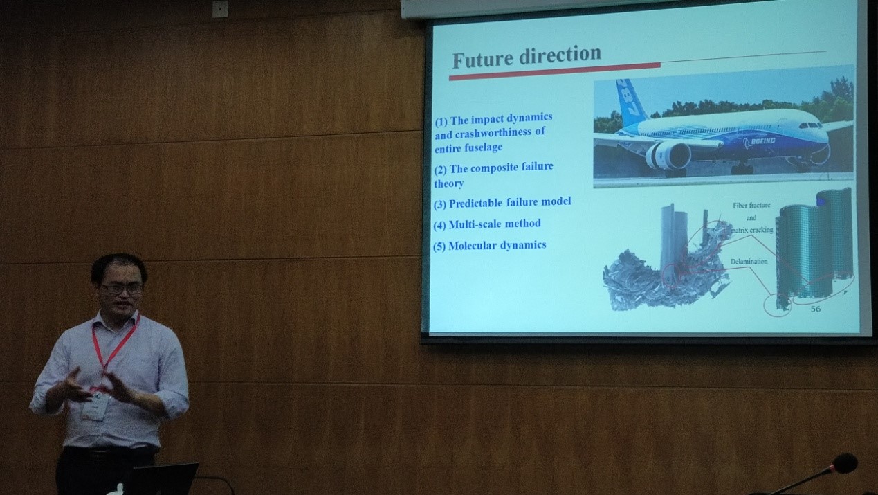 工程力学系支部书记湖南省力学学会副秘书长、美国航空航天学会“The Crashworthiness of Aircraft”。在报告的开始,任教授先介绍了湖南大学以及自己的实验室情况。然后任教授首先强调了防撞性研究的必要性。在美国就有EADS,一种可以旋转的结构来减小撞击时机体收到的破坏。任教授还分享了未来的研究方向,包括:2)复合破坏理论;4)多尺度法;特邀报告。