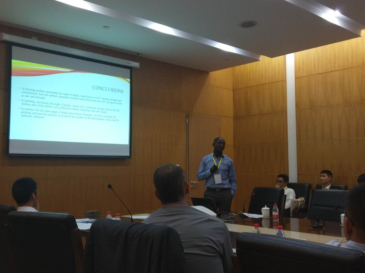 Aliyu宣讲的题目是《ANALYSIS OF AIRFOIL WAKE FLOW CHARACTERISTICS UNDER PITCHING AND HEAVING MOTION》