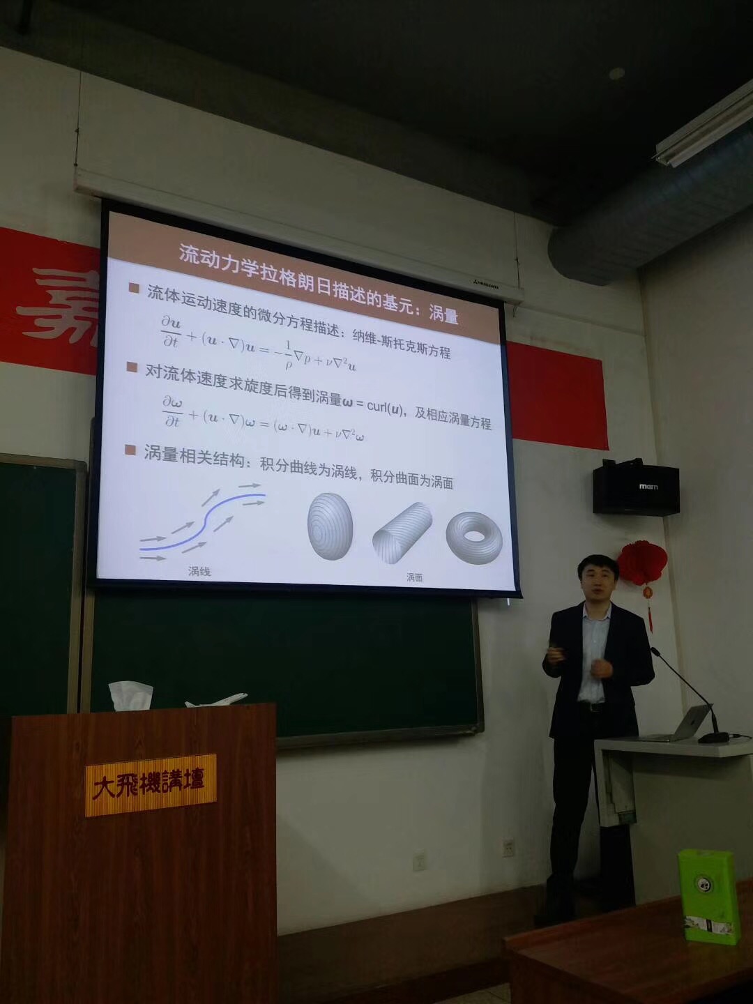 力学与工程科学系特聘研究员,国家级青年人才,获求是杰出青年奖。主要从事的研究方向为湍流、燃烧与计算流体力学。本次讲座中,杨越研究员围绕在转捩与湍流运动中如何有效的对拟序结构识别这一问题展开,通过拉格朗日演化观点提出了对拟序结构识别的涡面场方法。阐述了拉格朗日观点下湍流结构的生成机理,并形象的用浴巾卷绕反映“发卡涡”的演化过程。在讲座的最后,杨越研究员还利用标量图像中的小尺度结构壁面倾角信息对超声速边界层转捩中的摩擦阻力曲线进行了估测,并和在场的老师和同学们展开了热烈的交流与讨论。