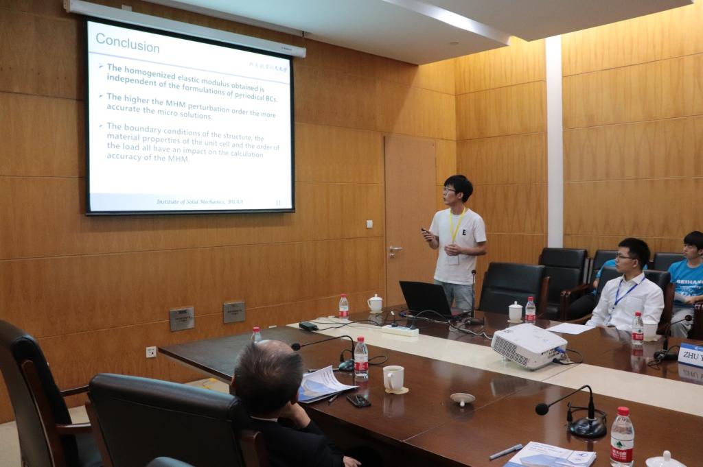 黄志伟的报告题目是《Exact solution of unit cell boundary condition problem in one-dimensional mathematical homogenization method》。