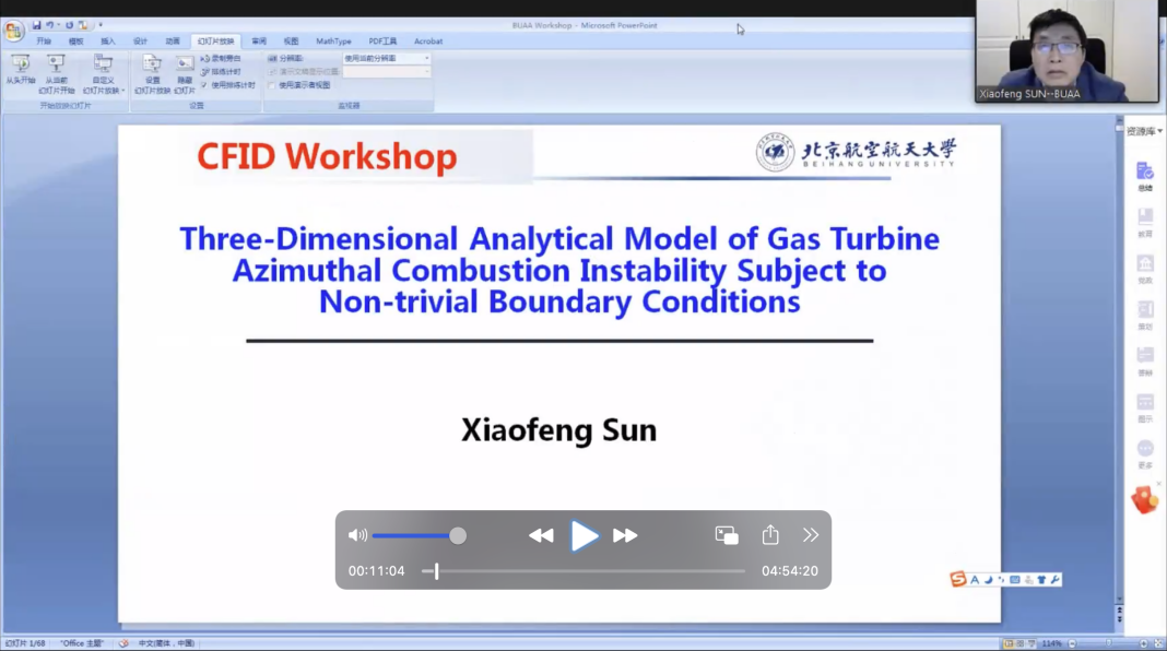 中国北京航空航天大学的孙晓峰教授以《Three-dimensional analytical model of gas turbine azimuthal combustion instability subject to non-trivial boundary conditions》为主题,围绕燃气轮机与航空发动机中的热声不稳定性的三维解析解模型问题,进行了本次研讨会的第一个报告。
