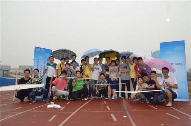 除了成功试飞滑翔机,本次课程的另一大亮点来自于同学之间的团结互助。课程未过半雨势突然增大,许多同学在到达田径场时并未携带雨伞,于是小组内成员在一把伞下调试滑翔机的情形成为田径场上一道独特的风景,同学们在合作中感受着友谊的温暖。小组间的关系也因为滑翔机的试飞而更加密切,试飞成功的小组成员主动帮助未试飞的小组组装调试或者安慰滑翔机受损的同学,虽然风雨带来了丝丝的凉意,但创意训练营却将同学们凝聚成一个团结的集体。全部小组的滑翔机试飞完成之后,全体创意训练营成员及指导老师在雨中合影留念,未来航空创意训练营圆满落幕。
