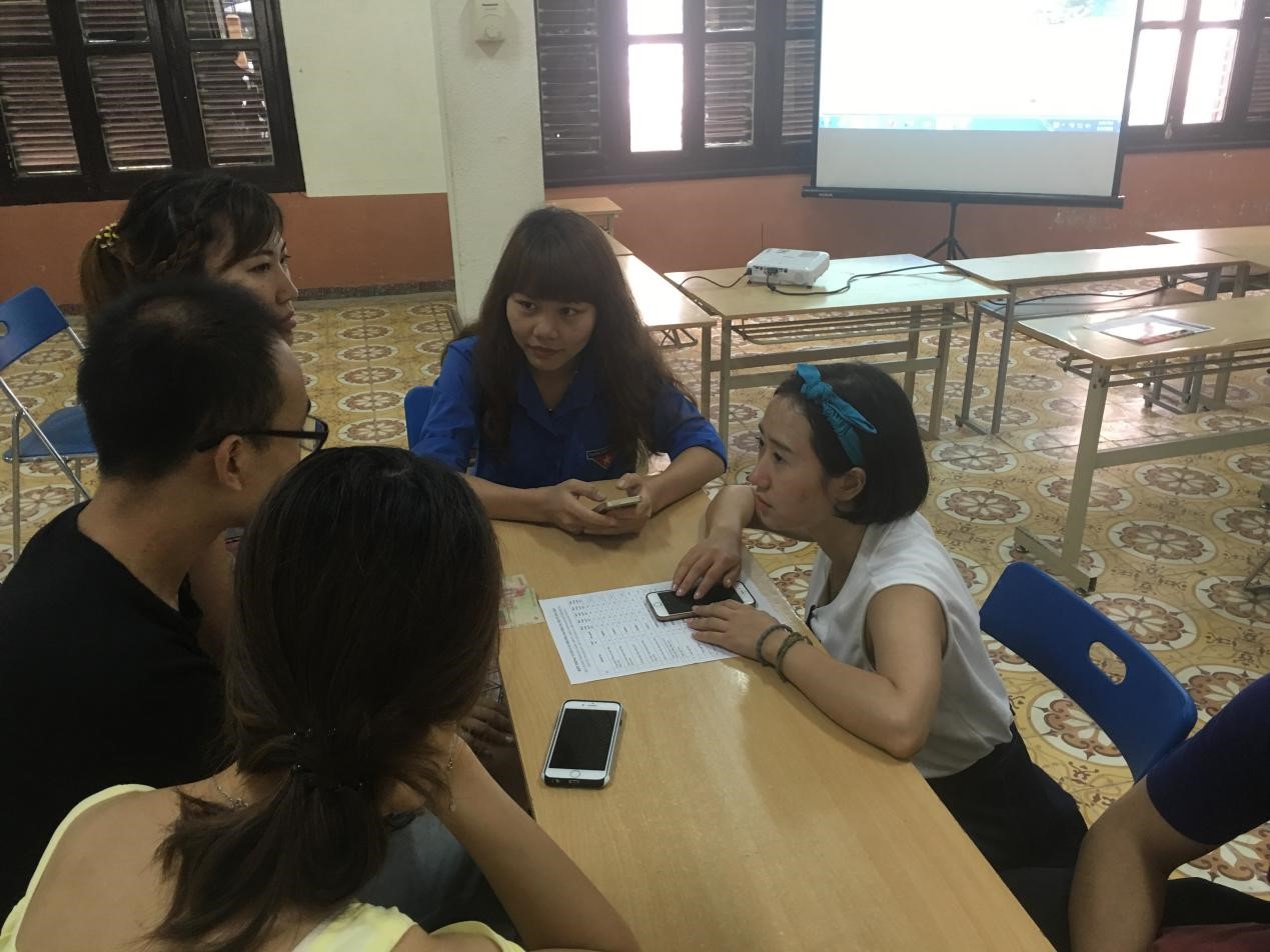 越南时间14:30,游学团与国立河内大学中文系同学在学校活动中心就校园文化、学生社团工作以及越南轻工业现状等方面的问题进行了讨论交流。交流中,首先由国立河内大学中文系阮进达同学介绍了国立河内大学概况,阮进达同学介绍了国立河内大学的历史沿革、专业设置以及特色活动;随后游学团领队蒋都辉同学介绍了完整足球比分
