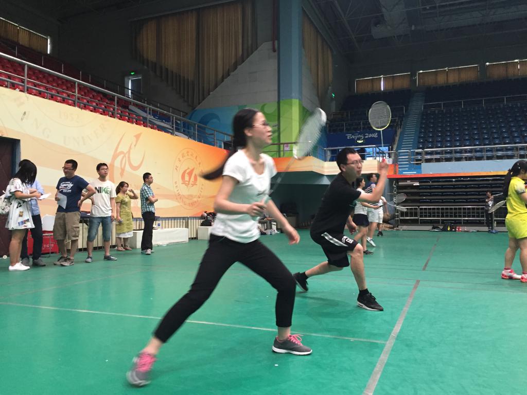 当天进行的是小组赛。在比赛中,每支队伍都顽强拼搏,挑战自我,赢得了场外观众的阵阵喝彩。混双的比赛也十分精彩,女队员的网前截杀,男队员的后场吊球,吸引了大批的观众。看着场上的比赛选手腾挪跳跃、身姿飒爽,坐在场边等待的选手和围观的羽毛球爱好者们也都跃跃欲试、纷纷在练习场地上一展身手。