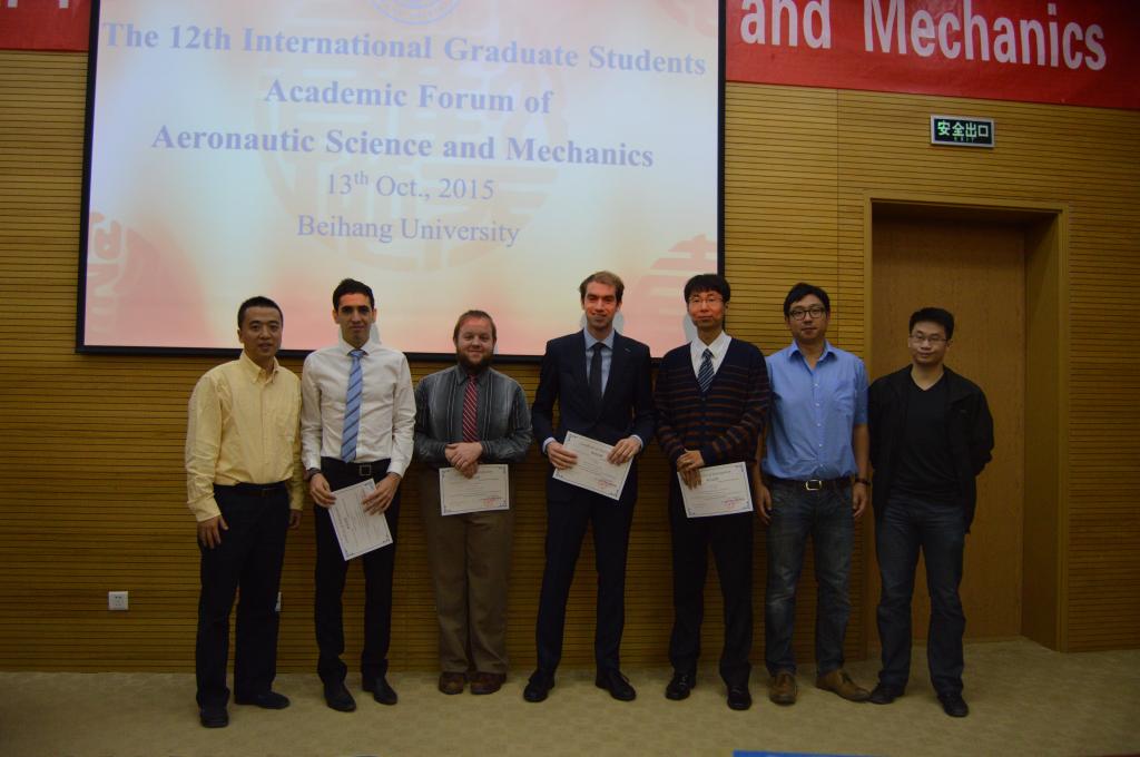 辅导员代表孙玉凯、外籍博士代表Ian Dettwiller依次发言。随后,研究生指导主任蒋崇文老师为外籍博士发放参会证书,并与外籍博士合影留念,标志着此次“歼十”杯学术论坛国际化分论坛正式开始。