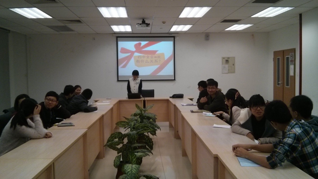 会议内容及主要精神。通过此次环节,党支部成员了解了此次第十八届四中全会的基本性质及情况,并获知了此次全会的成果。