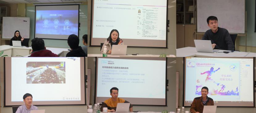 接着,六位学长学姐依次为大家讲述了其求职过程中的经历和经验。杨燕玲学姐分别介绍了群面、二面以及offer的选择等方面需要注意的问题和其在面试中的经历;胡逸雯学姐就简历的制作做出来了详细的介绍,并为大家推荐了制作简历的软件工具;两位学姐在谈到求职中都谈到女性求职的困难。韩旭学长用其诙谐幽默的话语为大家讲述了他在求职中遇到了有趣经历以及各个院所的的薪资待遇,逗得同学们都哈哈大笑;刘芳麟学长重点提出了院所对个人学习能力的看重以及针对专业不对口工作如何准备面试;黄铮学长分别就求职前期准备、如何收集求职信息、如何选择自己想要的工作做了详细介绍;张强学长详细介绍了611所“open day”的流程和面试技巧,也浅谈了自己在求职中的经历。
