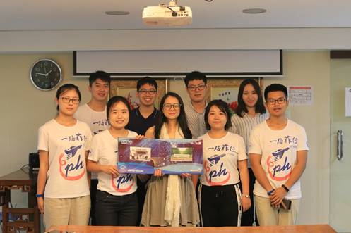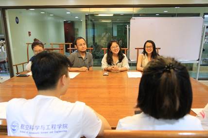 发展看中国国际影响力、对于国内青年学生的希望和寄托等内容展开,梁院长和青年志愿者老师都做了详尽的介绍,团队成员大有启发。结束访谈后,梁院长、青年教师和游学团队的成员共持北航邮册,亲密地合影留念。