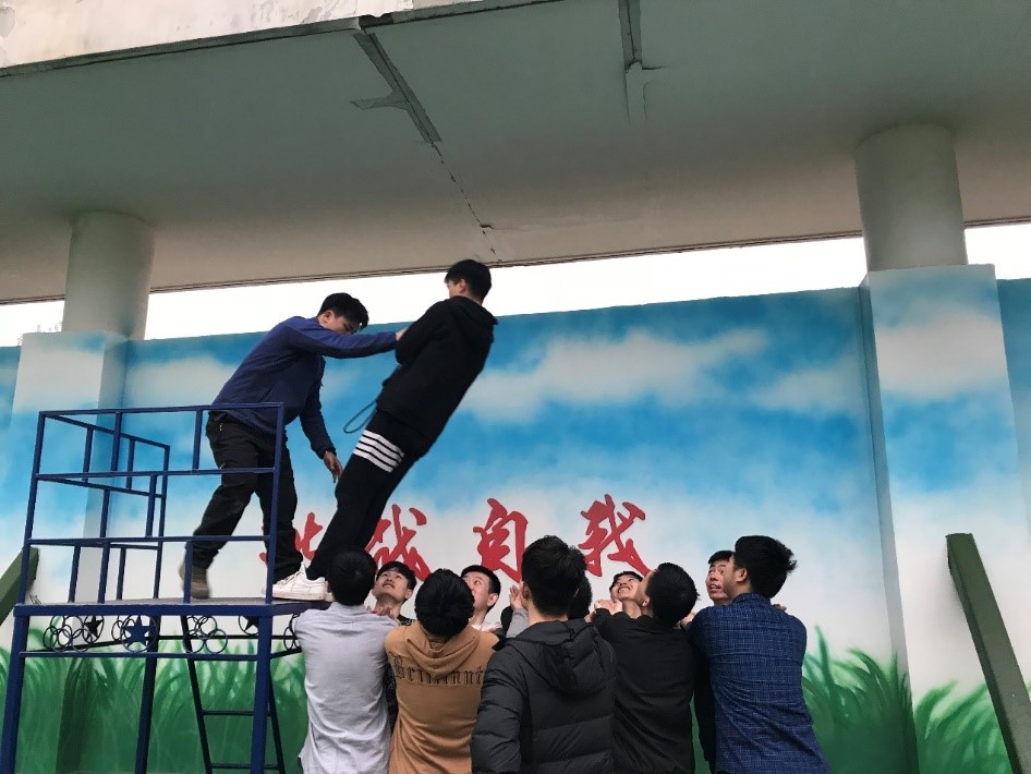 最后的挑战也是最难的挑战,那就是激动人心的信任背摔了。每位“背摔者”上台之前都会说一段鼓舞团队士气的话,同时每位“接人者”也会在“背摔者”上台之前给予其鼓励,让其放心,双方都给予了对方最深厚的信任——别害怕,有我们呢!每一次我们都绷紧身体,互相依靠,为背摔的同学构建一个最扎实的屏障。挑战的同学也心无杂念,没有任何一个人畏惧或退缩。团队的成员之间互相给予了最充分的信任。