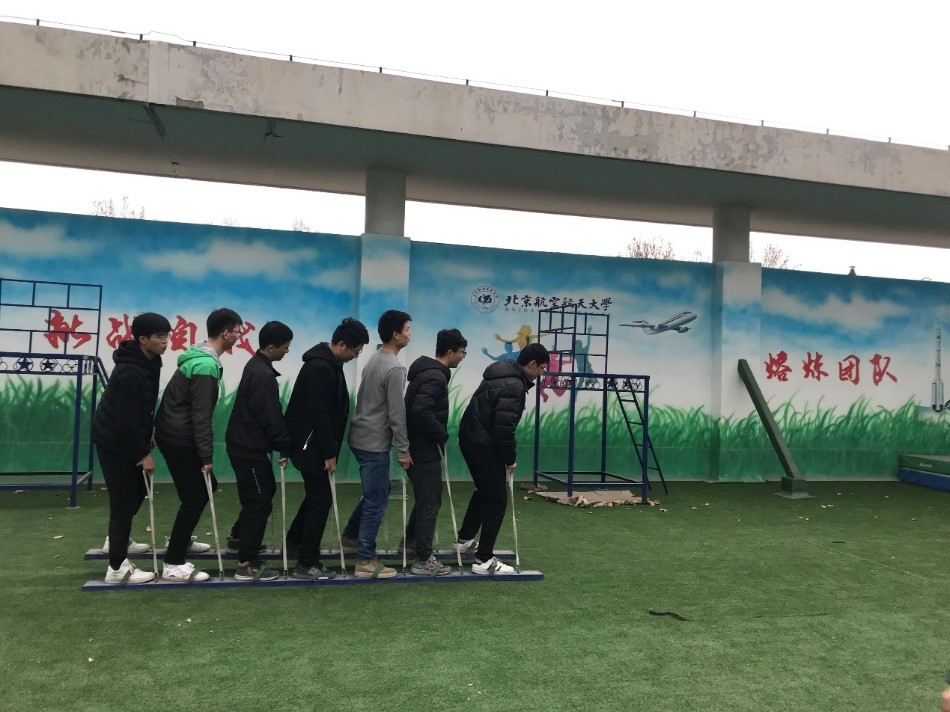 活动在教练的引领下,顺利展开。两支队伍在游戏中你追我赶,全力以赴,力争上游。第一个小挑战中,5名队员需要在教练的要求下协同合作,每人仅用一只手的两根手指,将队长维持脱离地面的状态5秒钟。这考验了我们的思考变通与协同配合能力,在比赛的过程中,我们出奇的协同与默契,成功的完成了比赛任务。