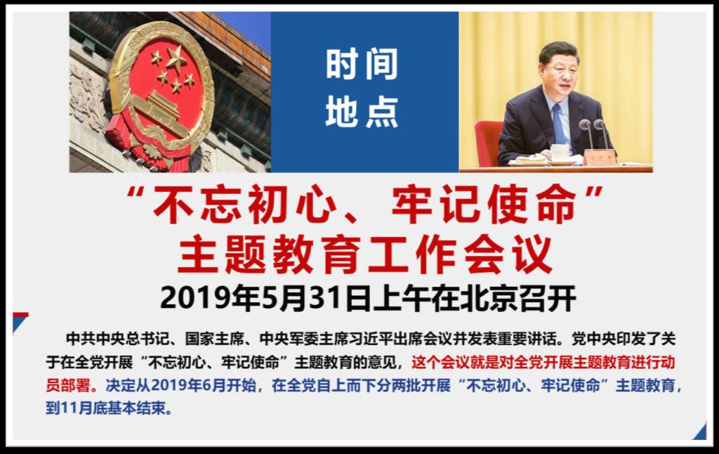 “不忘初心 牢记使命”主题教育,是习近平总书记在十九大报告中提出的,并在2019年5月31日召开了主题教育工作会议,做出动员部署。中国特色社会主义事业发展到今天,我们取得了非凡成就,也面临着方方面面的严峻考验,既要不断推进党的建设,又要时刻防范各类风险与挑战,对党的队伍提出了更高要求。本次主题教育,是用习近平新时代中国特色社会主义思想武装全党、推进新时代党的建设、保持党同人民血肉联系、实现党的十九大确定的目标任务的迫切需要,对全体党员提出了“守初心、担使命、找差距、抓落实”的总要求。