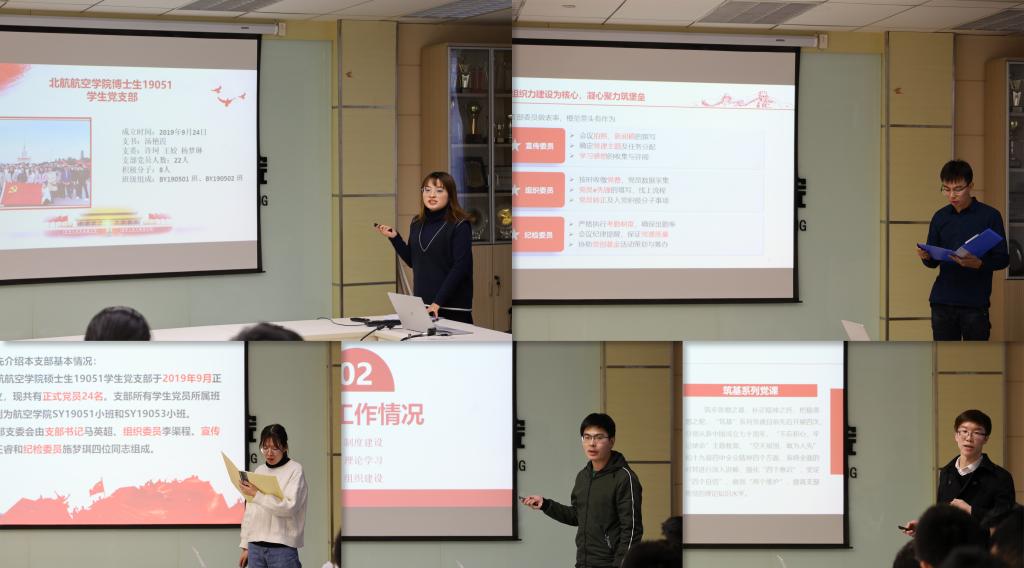 本科生1605学生党支部聚焦“原著原文”、“廉政意识”、“时事政治”、“空天报国”四个主题开展学习,从“读、写、讲、议”四个步骤提高了理论学习成效。博士生18051学生党支部组建了“出题小组”,多次会议学习后通过线上出题、答题巩固了学习成果。硕士生19054学生党支部通过扎实的积极分子培养考察工作安排,妥善做到了一对一培养、引导和考察。大飞机班17DF学生党支部利用“图书角”,存放党史党建、系列讲话相关书籍,方便了支部同学的日常学习。其他党支部书记也分别分享了他们的支部建设经验和成绩。