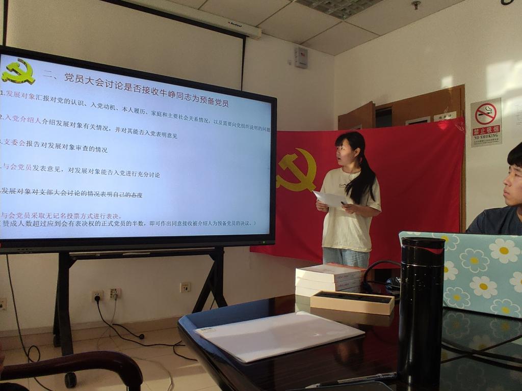 发展对象牛峥同志向大会汇报对党的认识、入党动机、主要社会关系和个人经历等基本情况,入党介绍人马晓强同志介绍其思想情况,支部书记强鑫同志汇报支委会对发展对象审查的情况,与会党员发表意见。大会采取无记名投票方式进行表决,通过了接收牛峥同志为预备党员的决议。