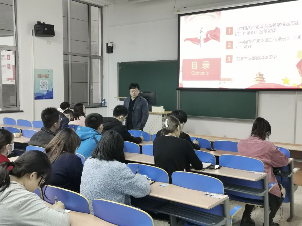 党委书记林贵平教授围绕“基层党支部建设规范”,为全院学生党支部书记、新任支部委员讲授党课,专职辅导员杨锐参会。