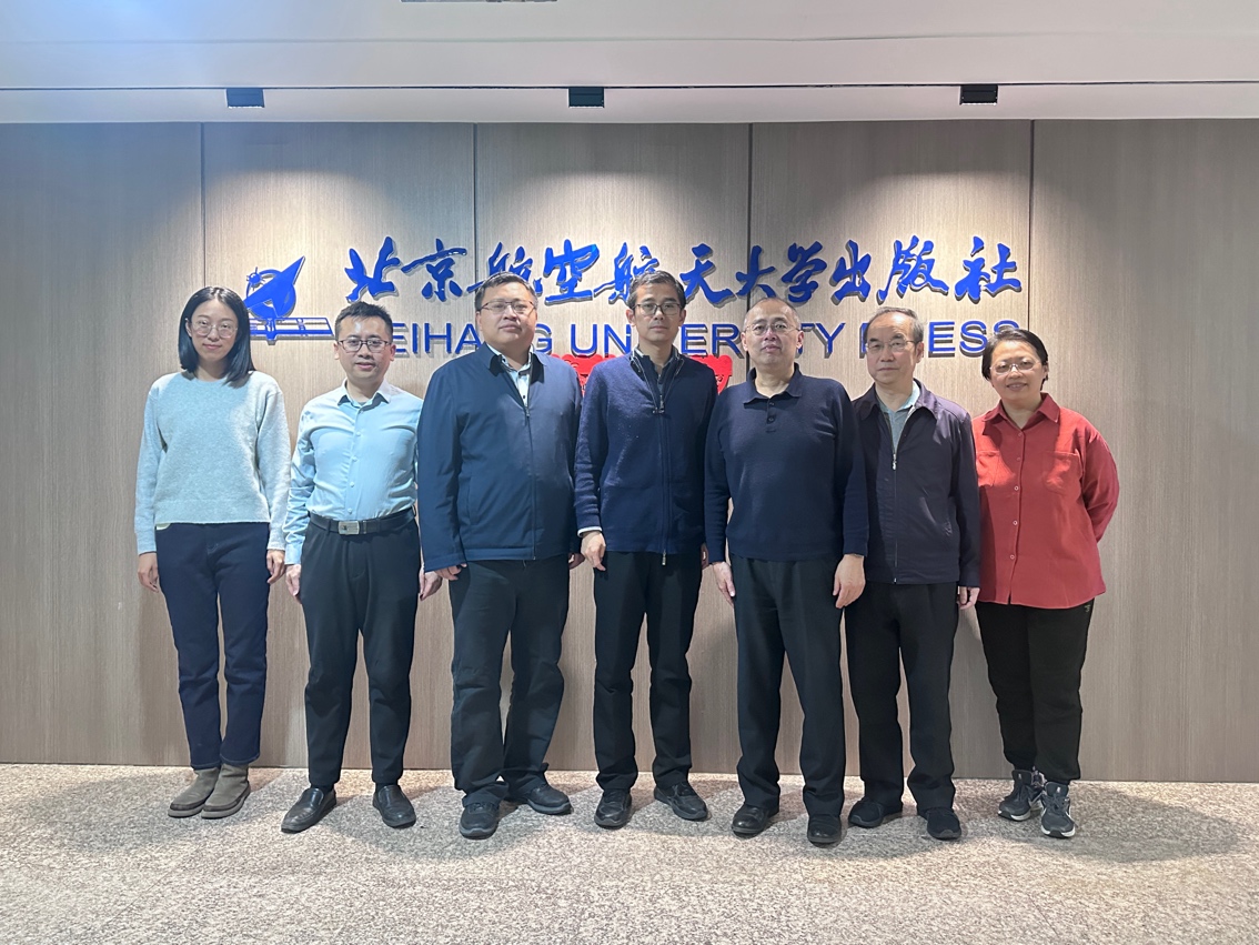 院长潘翀、副院长罗明强带队赴北京航空航天大学出版社开展调研,北航出版社董事长刘德生、副总经理赵延永、总编辑王雷华、高教出版分社社长蔡喆等领导出席此次活动,并一同参与了调研研讨会。双方就航空航天类教材建设、国家教材建设重点研究基地工作开展等重要议题展开了交流与探讨。