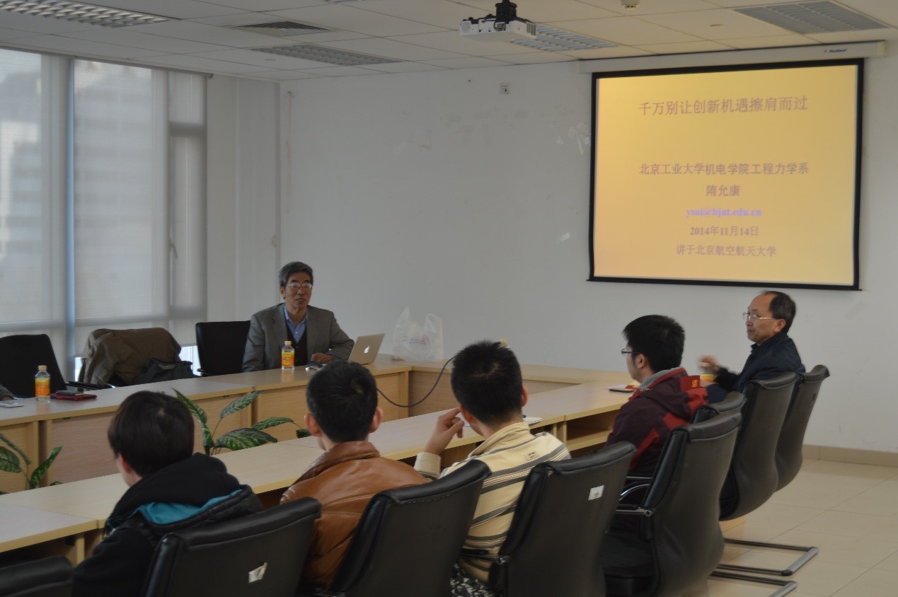 2014年11月21日下午2:30至4:30在完整足球比分 C706会议室举办了完整足球比分 固体力学前沿讲座本学期第9次报告,北京工业大学的隋允康教授应完场足球赛果 邢誉峰教授的邀请做了题为《千万别让创新机遇擦肩而过》的学术报告。