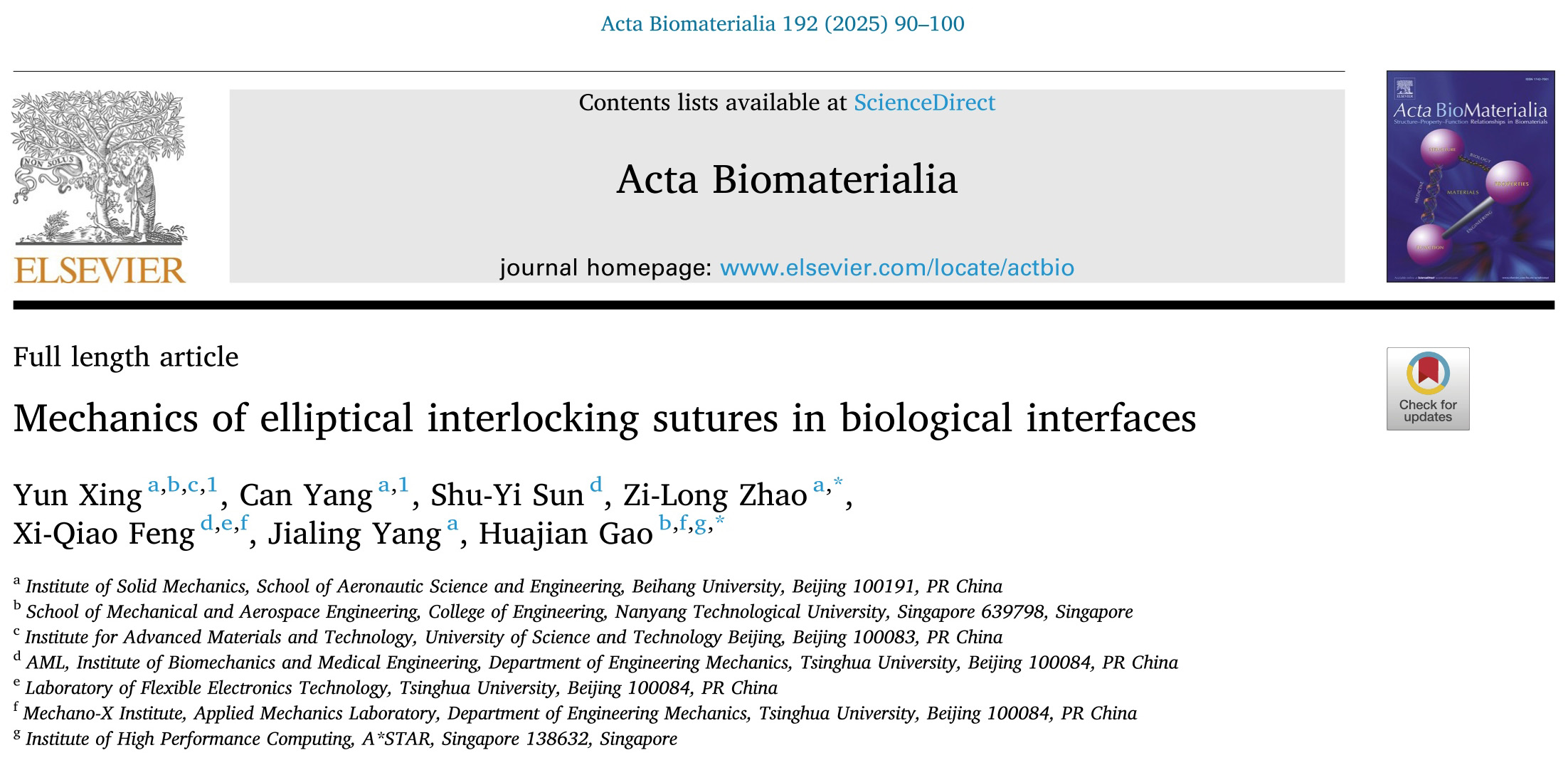 赵子龙教授、杨嘉陵教授及其合作者在生物材料学顶级期刊《Acta Biomaterialia》发表论文《Mechanics of elliptical interlocking sutures in biological interfaces》。他们针对生物互锁界面开展研究,将甲虫翅鞘的椭圆型骨缝结构作为研究对象,建立了可以精确预测结构拉拔与失效行为的力学模型,揭示了此类结构的强韧化与优化机理。 经过长期的演化,许多生物结构进化出了复杂而精巧的界面形貌。这些结构具有优...